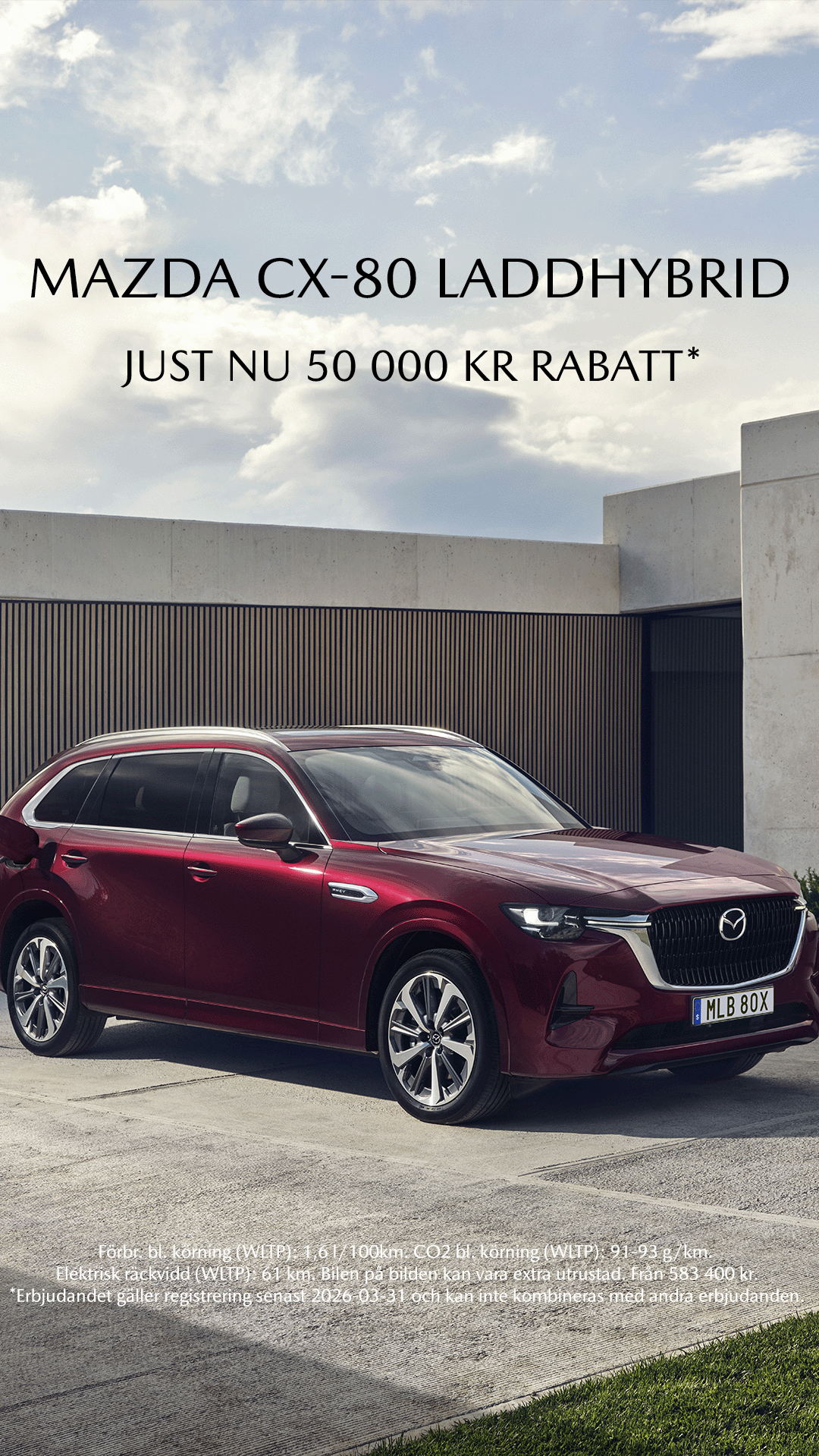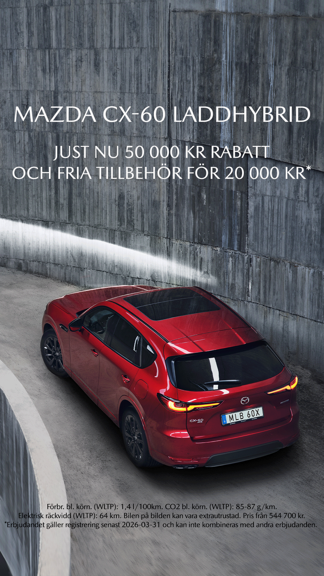 50.000 kr i rabatt på Mazda 6e. Gäller för registrering före 31 mars 2026, kan inte kombineras med andra erbjudanden.